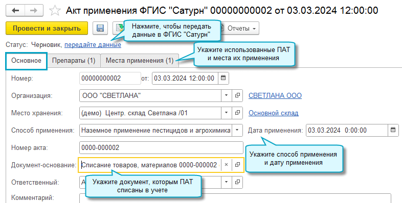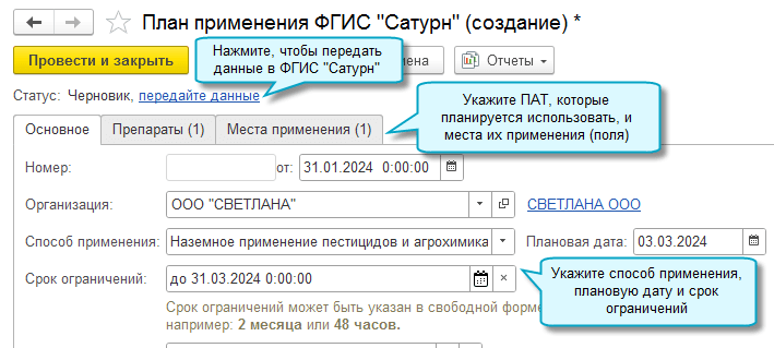 Добавлена возможность обмена данными о пестицидах, агрохимикатах и тукосмесях (ПАТ) с Федеральной государственной информационной системой "Сатурн". В ФГИС "Сатурн" вносится информация о ПАТ, зарегистрированных в Государственном каталоге пестицидов и агрохимикатов, разрешенных к применению на территории РФ (Федеральный закон от 19.07.1997 № 109-ФЗ, Постановление Правительства РФ от 07.05.2022 № 828).