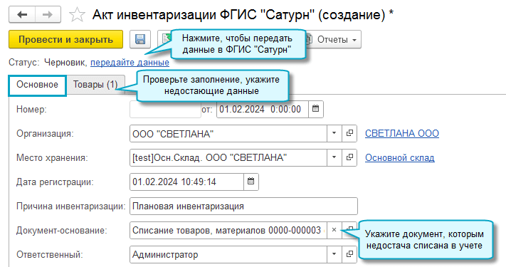 Если данные передаются в ФГИС "Сатурн" позже или другим сотрудником, удобно это делать из рабочего места Обмен с ФГИС "Сатурн".
