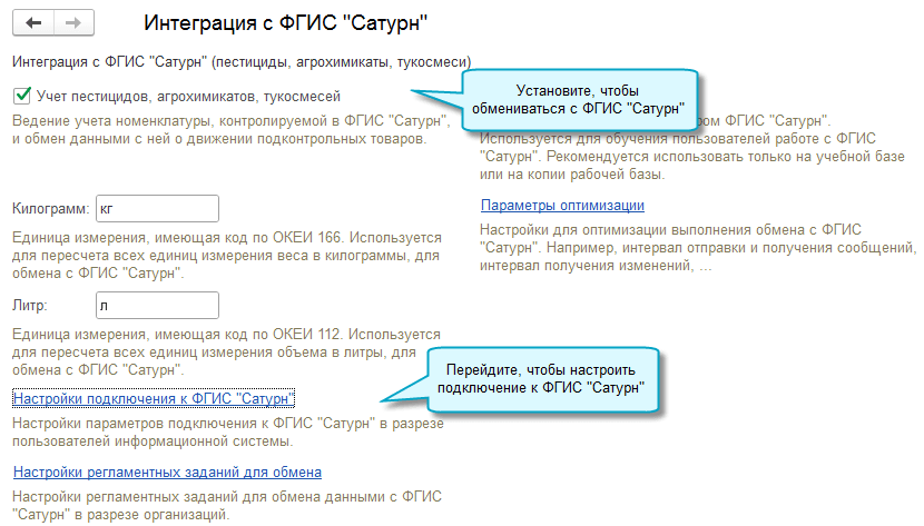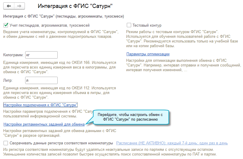 Полный интерфейс: меню "Администрирование - Настройки программы - Интеграция с ФГИС "Сатурн" (пестициды, агрохимикаты, тукосмеси) - Настройки регламентных заданий для обмена".