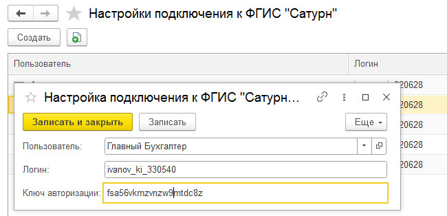 В настройках подключения укажите логин пользователя в ФГИС "Сатурн", а также ключ авторизации, который можно получить через Web-интерфейс по ссылкам: