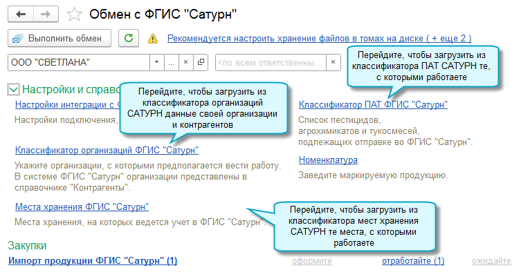 Полный интерфейс: меню "Администрирование - Сервис - Обмен с ФГИС "Сатурн" - Настройки и справочники".
