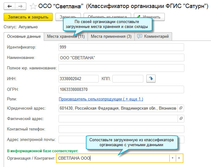 Для загруженных организаций из классификатора САТУРН укажите соответствующие им организации в информационной базе. По своей организации также сопоставьте места хранения САТУРН и склады, заполните места применения.