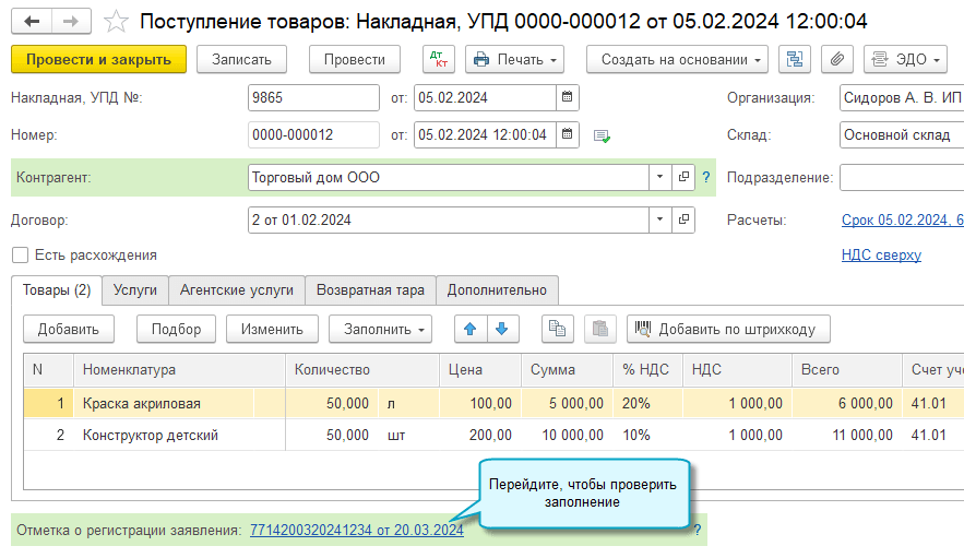 Полный интерфейс: меню "Покупки - Покупки - Поступление (акты, накладные, УПД)".