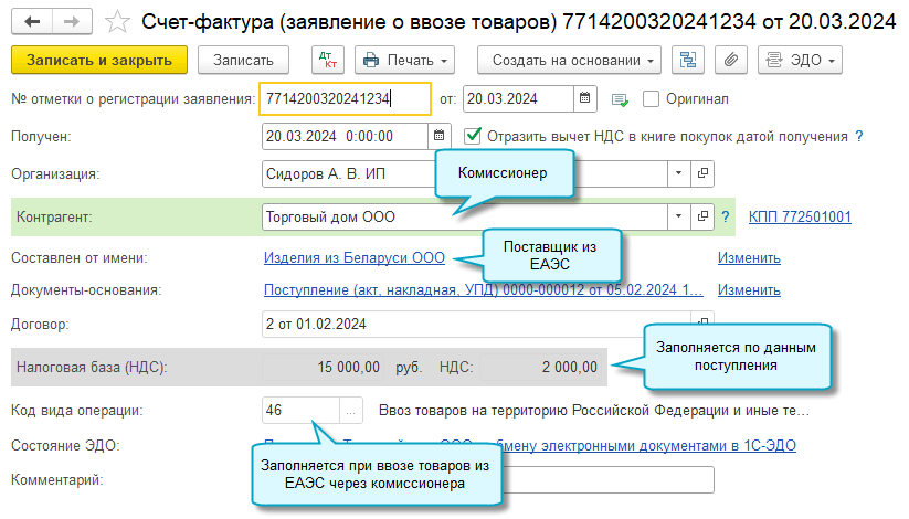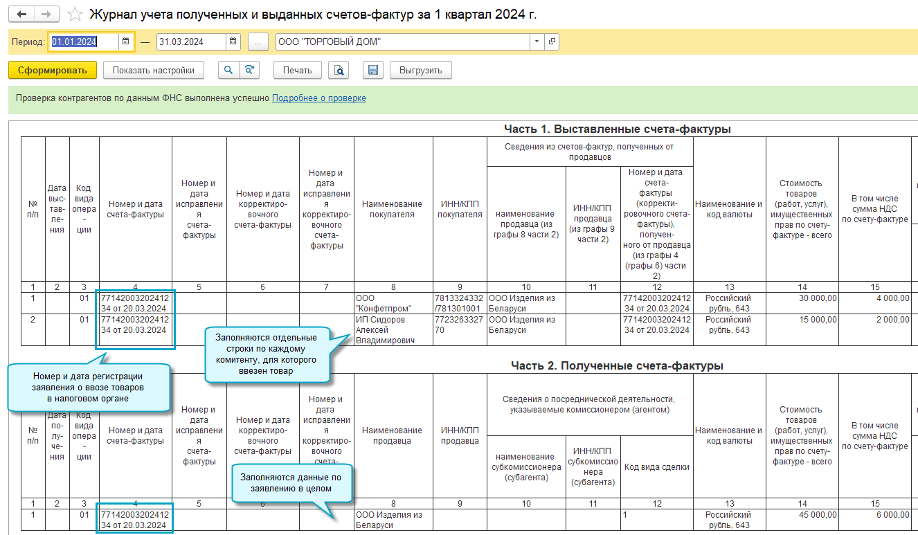 Добавлена возможность организациям и ИП заполнить журнал учета счетов-фактур, когда они по договорам комиссии закупают и ввозят товары из стран ЕАЭС для комитентов - российских организаций или ИП (Письмо ФНС России от 04.04.2024 № СД-4-3/3936@, см. подробнее).