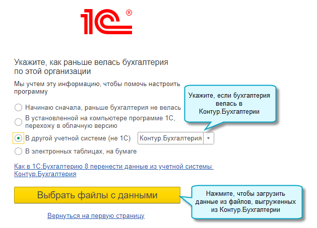 Добавлена возможность загрузить данные в облачную версию программы, если раньше бухгалтерия велась в системах Контур.Бухгалтерия, Контур.Эльба, Моё дело.