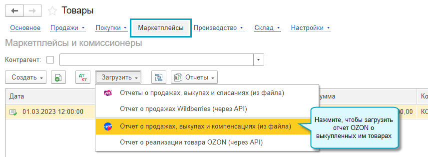 Полный интерфейс: меню "Продажи - Продажи - Маркетплейсы и комиссионеры".