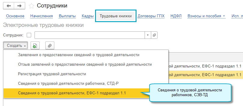 Полный интерфейс: меню "Зарплата и кадры - Кадры - Электронные трудовые книжки".