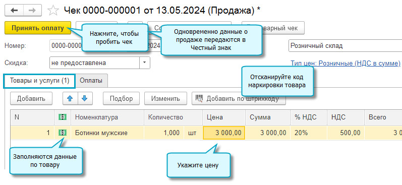Простой интерфейс: меню "Товары - Продажи - Розничные продажи".