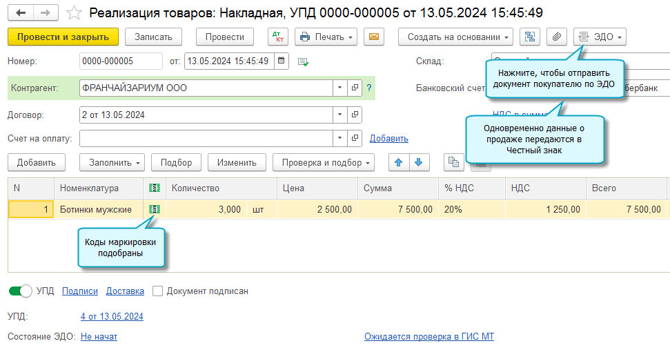 Информация о кодах маркировки проданных товаров передается в ГИС МТ при отправке покупателю документов по реализации по ЭДО и пробитии чеков по розничным продажам.