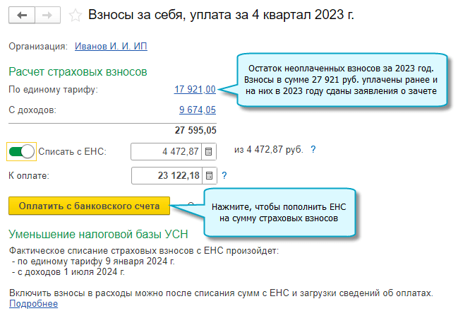 С 2024 года страховые взносы ИП за себя учитываются в налоговых расходах по дате списания средств с ЕНС в счет их уплаты, когда ИП применяет УСН "доходы минус расходы" или общую систему налогообложения - НДФЛ.