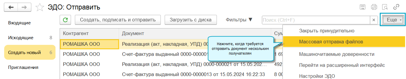 Добавлена возможность массового создания и отправки электронных документов. Применяется, когда требуется отправить один файл нескольким получателям, например, разослать прайс-лист.