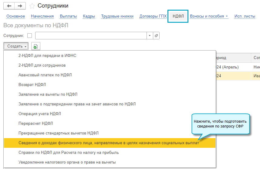 Добавлена возможность подготовить и отправить по запросу СФР сведения о доходах физического лица в целях назначения социальных выплат (Письмо ФНС России от 17.04.2024 № БС-4-11/4544@).