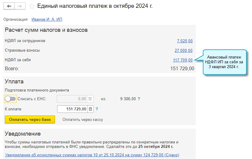 Начиная с авансовых платежей за 3 квартал 2024 г. НДФЛ ИП за себя включается в общую сумму единого налогового платежа за месяц.