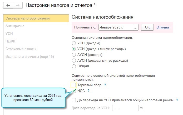 Добавлена возможность указать, какая ставка НДС применяется организацией, уплачивающей УСН, с 01.01.2025 при превышении доходов суммы 60 млн.рублей.