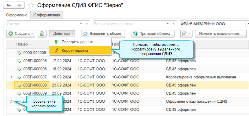 - из списка Оформление СДИЗ ФГИС "Зерно" по кнопке Создать - Корректировочный СДИЗ;