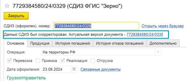 Добавлена возможность по документам Оформление СДИЗ ФГИС "Зерно" корректировать: