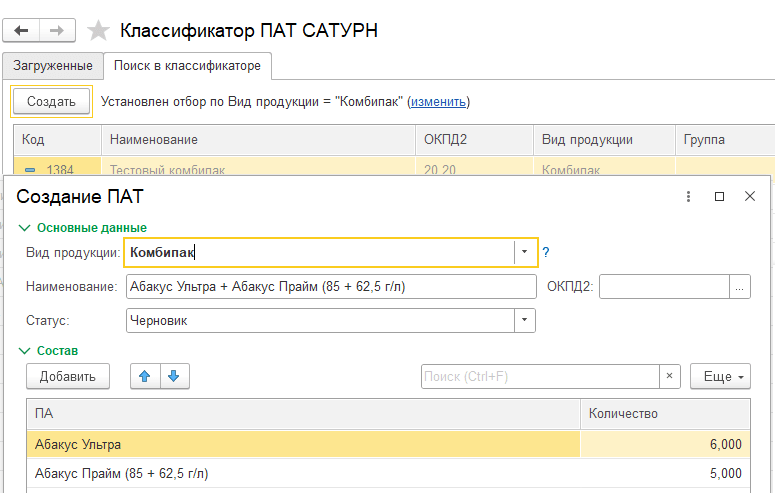 В классификатор ПАТ Сатурн добавлен вид продукции Комбипак.