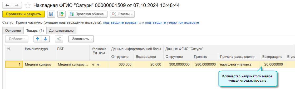 В случае частичной приемки после подтверждения документ переходит в статус Принят частично (ожидает подтверждения возврат).