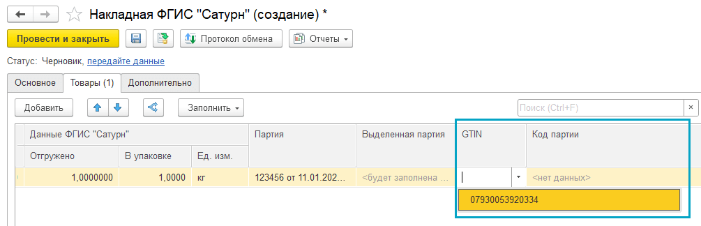 В документе Накладная ФГИС "Сатурн" в таблицу Товары добавлены реквизиты: