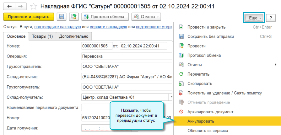 Теперь можно отменить последнее движение и перевести документ Накладная ФГИС "Сатурн" в предыдущий статус. Для этого добавлена команда Аннулировать.