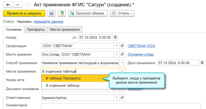 В документе Акт применения ФГИС "Сатурн" теперь можно указывать для каждого препарата свое место применения.