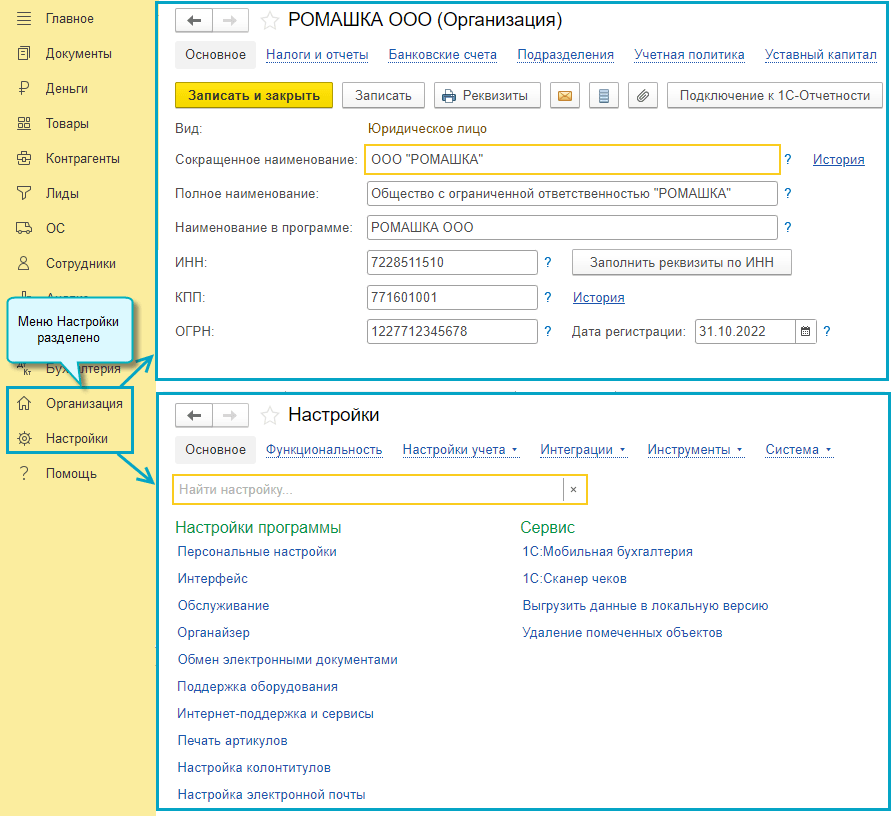 Раздел Настройки в простом интерфейсе разделен на два раздела: