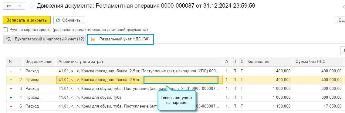 Теперь после перехода от учета запасов по партиям к учету без разбивки по партиям, когда в учетной политике изменяется способ оценки МПЗ с метода ФИФО на оценку по средней, остатки запасов учитываются без партий в бухгалтерском учете, налоговом учете и в регистре по раздельному учету НДС, когда он применяется.