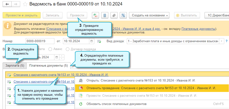 Изменение оплаченной ведомости влияет на учет НДФЛ. Поэтому, прежде чем отредактировать ведомость, теперь требуется отменить проведение всех платежных документов.