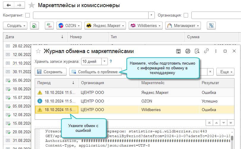 Теперь сохраняются результаты обмена по API c маркетплейсами. По обмену, завершенному с ошибкой, можно сразу подготовить письмо с необходимой технической информацией для ее расследования.