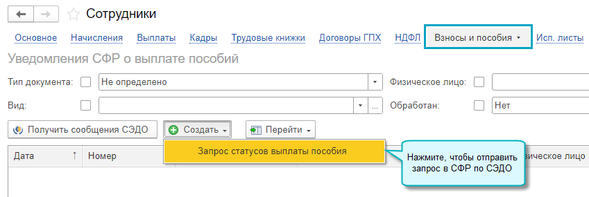 Здесь же можно отправить в СФР запрос статусов выплаты пособия.