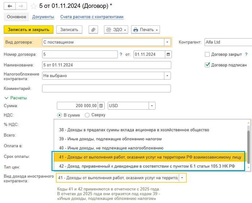 Добавлены коды 41 и 42 в перечень видов доходов иностранного контрагента. Раньше для таких доходов использовался код 39.