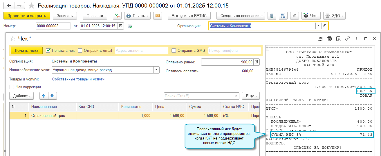 Добавлена возможность пробивать кассовые чеки со ставками НДС 5% и 7% плательщикам УСН c 01.01.2025. Дополнительные настройки в программе не потребуются, достаточно указать ставку НДС в документе реализации.