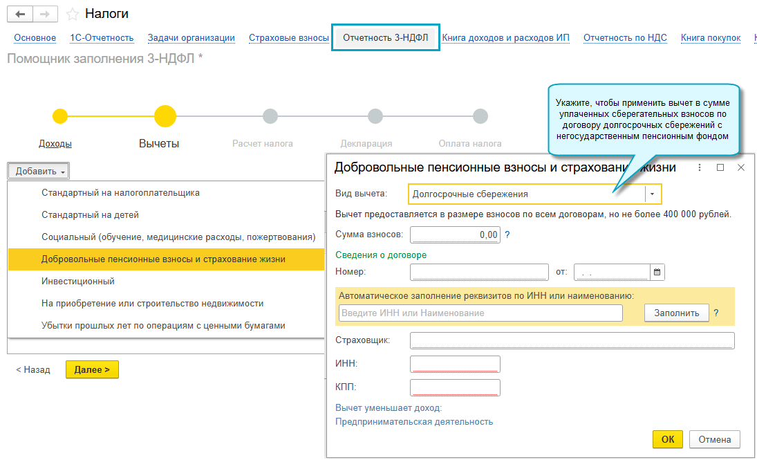 Полный интерфейс: меню "Отчеты - Отчеты для ИП - Помощник заполнения 3-НДФЛ".