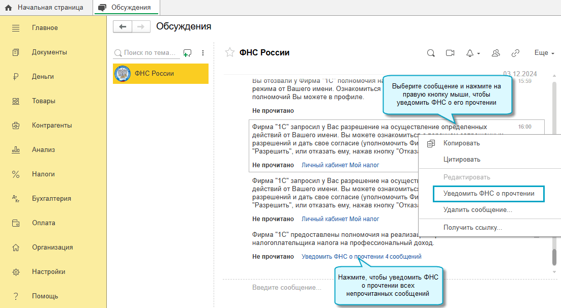 Добавлена отметка о прочтении в список сообщений ФНС, полученных из сервиса "Мой налог", для самозанятых.