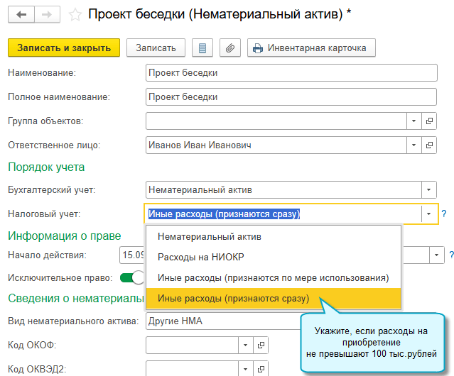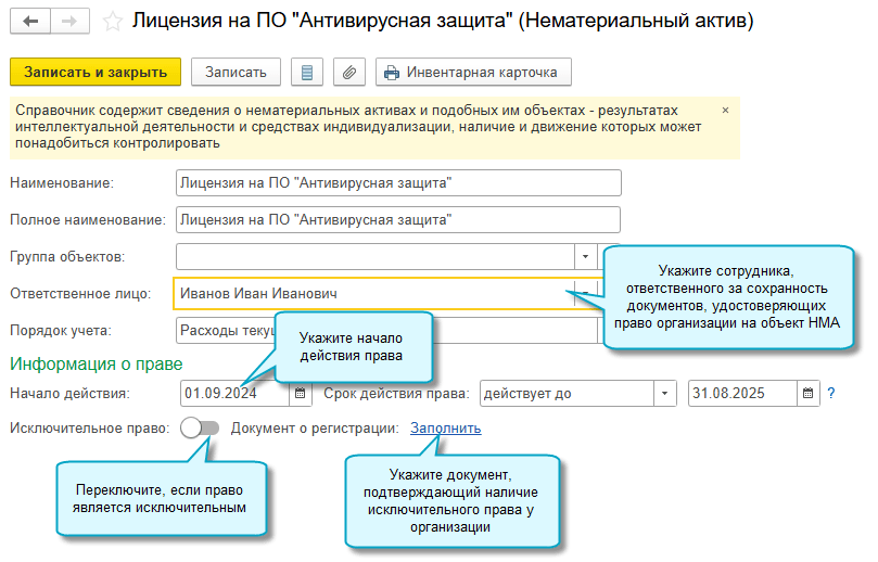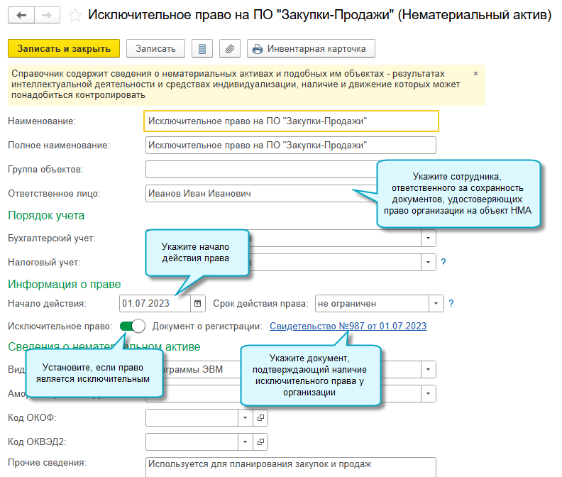 В карточки НМА добавлены реквизиты, необходимые для проведения инвентаризации: ответственное лицо, дата начала действия права, признак наличия исключительных прав и документ о регистрации исключительных прав.