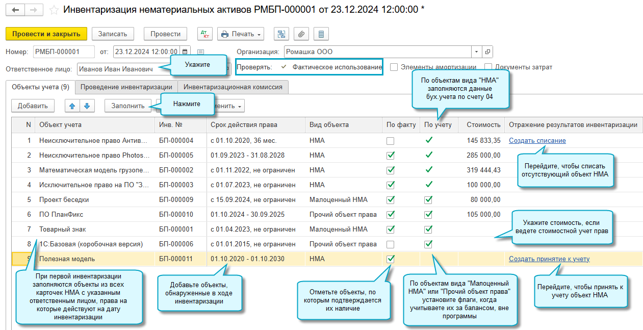 Заполните эти реквизиты в имеющихся карточках НМА перед проведением инвентаризации.