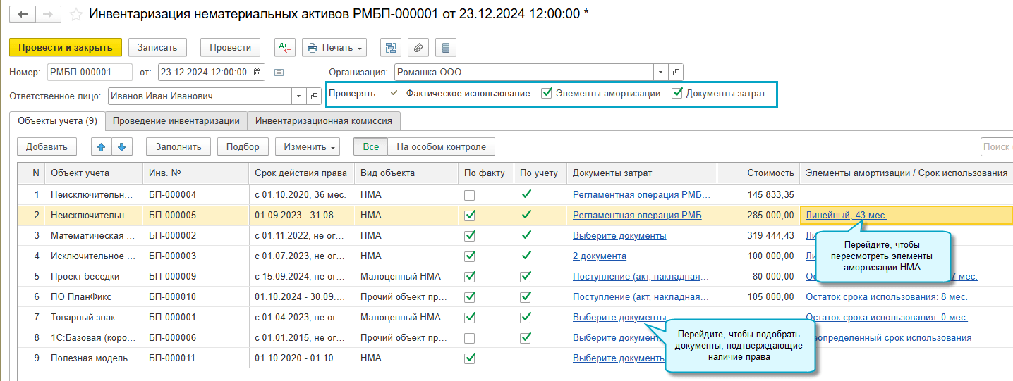 Добавлена возможность оформить инвентаризацию объектов НМА и других подобных объектов - результатов интеллектуальной деятельности и средств индивидуализации.