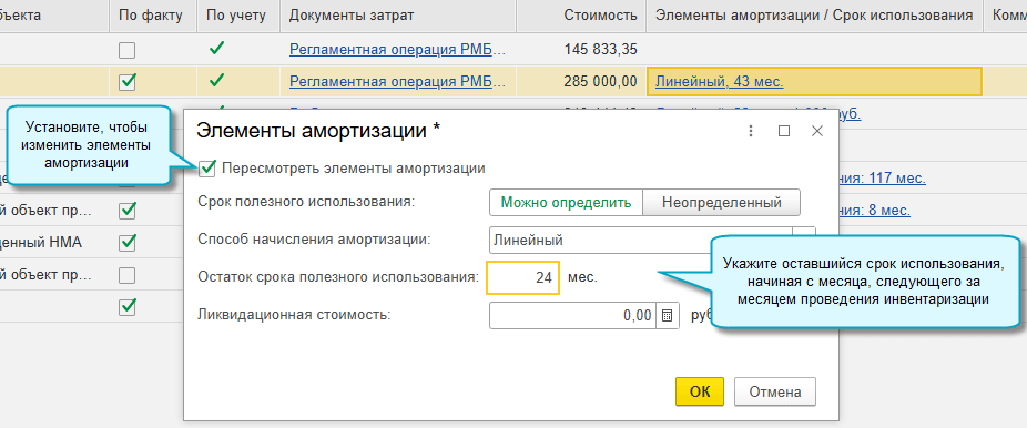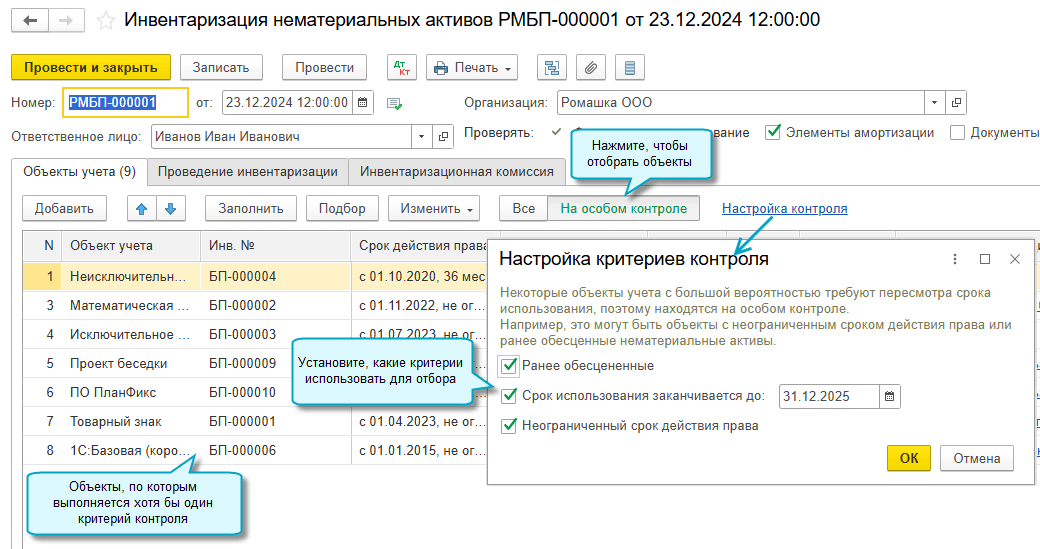 Если объектов много, чтобы не пропустить те, которые требуют особого внимания при пересмотре элементов амортизации, например, с неограниченным сроком действия права, используйте переключатель "На особом контроле".