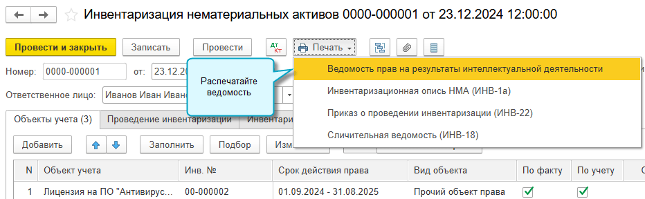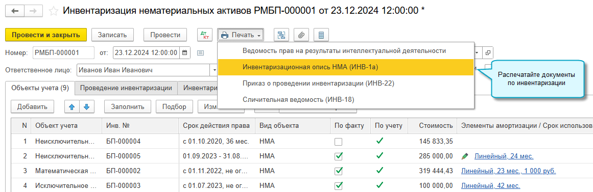 Можно заполнить и распечатать Приказ о проведении инвентаризации (ИНВ-22), Инвентаризационную опись НМА (ИНВ-1а) и Сличительную ведомость (ИНВ-18), а по объектам, не являющимся НМА - Ведомость на результаты интеллектуальной деятельности.