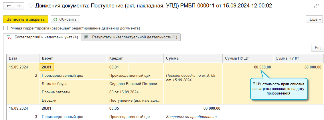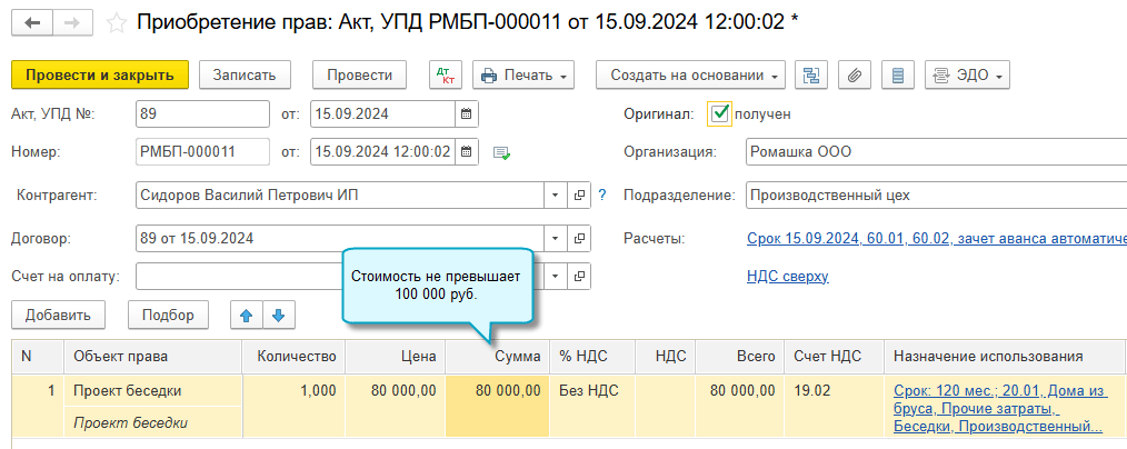 Теперь документ Поступление (акт, накладная, УПД) с видом операции "Права" можно использовать для учета исключительных прав со сроком использования более 12 месяцев, но стоимостью не более 100 000 рублей. Затраты на их приобретение будут включаться в расходы в налоговом учете по налогу на прибыль единовременно, на дату приобретения.