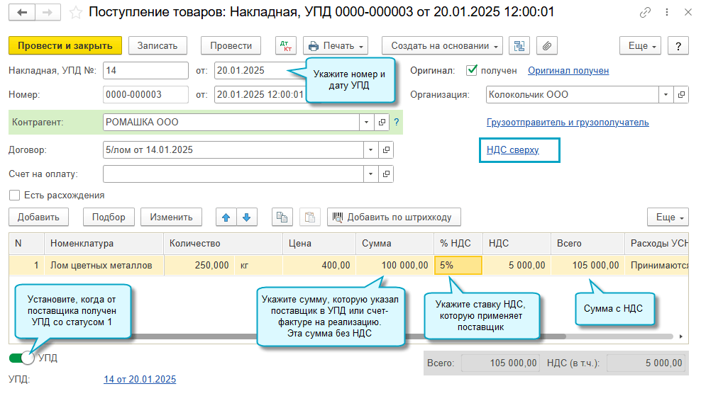 3. Начислите НДС при получении товара от поставщика. Для этого при поступлении зарегистрируйте УПД со статусом 1 или счет-фактуру, которую получили от поставщика