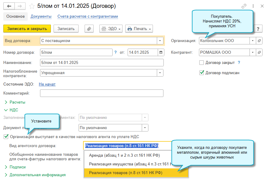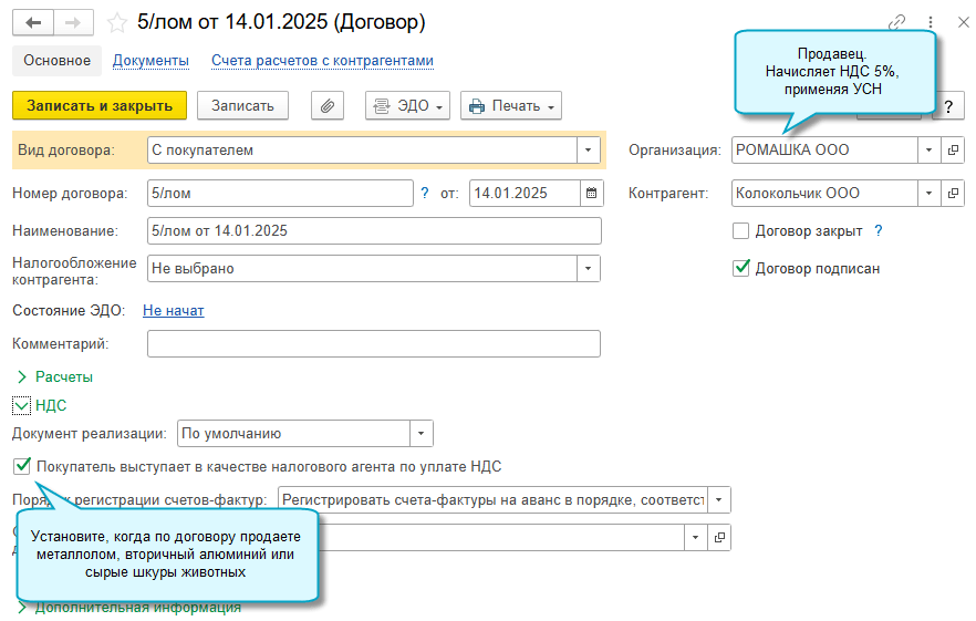 1. Укажите в договоре, что покупатель выступает в качестве налогового агента по уплате НДС. Сообщите покупателю, какую ставку НДС применяете - 5%, 7% или 20%