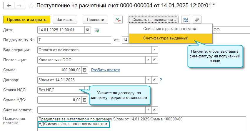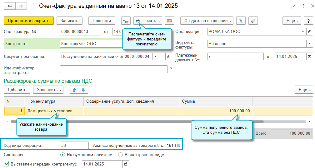 2. Оформите счет-фактуру при получении аванса от покупателя