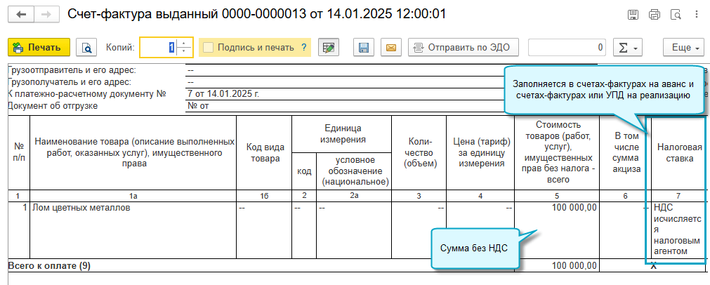 В них, как при авансе, проставляется отметка "НДС начисляется налоговым агентом"