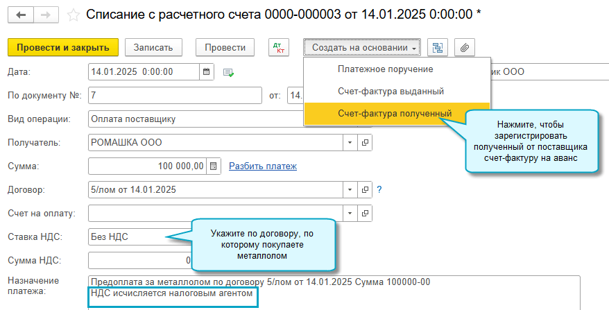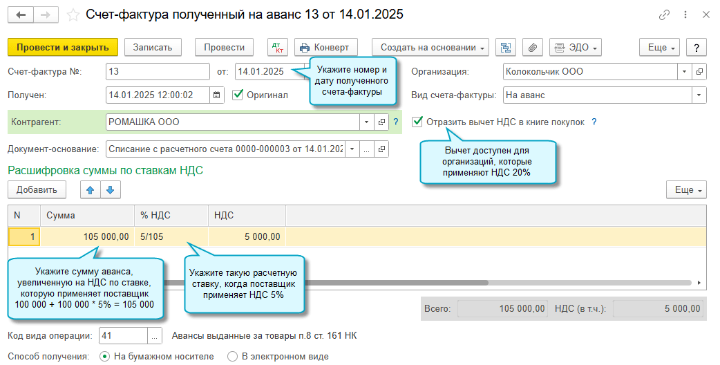 2. Начислите НДС при перечислении аванса поставщику. Для этого зарегистрируйте счет-фактуру на аванс, которую получили от поставщика