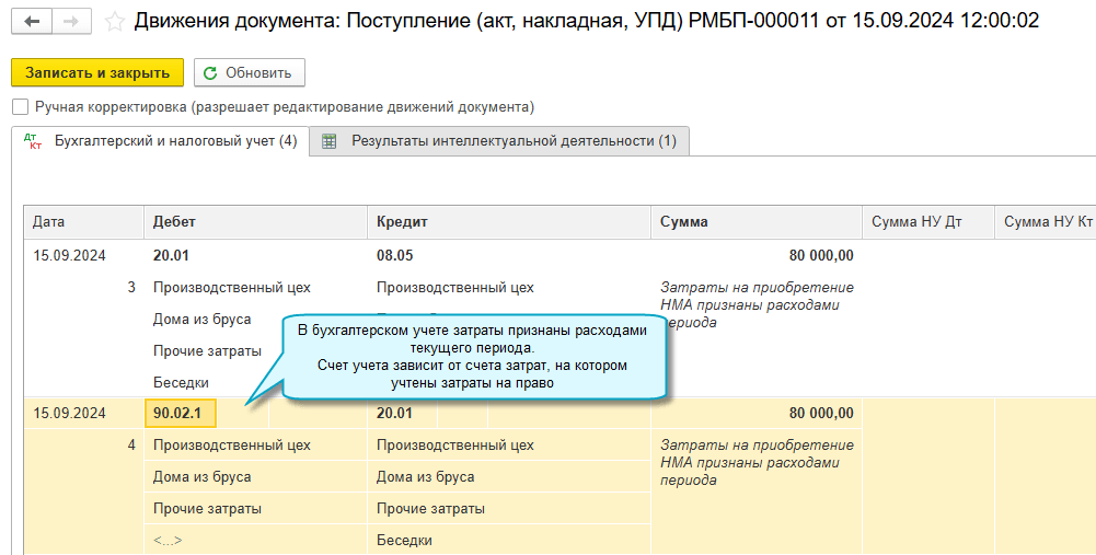 Затраты на приобретение НМА, стоимость которых не превышает лимит стоимости НМА, установленный в учетной политике, теперь включаются в бухгалтерском учете в расходы при проведении документа Поступление (акт, накладная, УПД) с видом операции "Права". Не учитываются, как раньше, в расчете себестоимости продукции, работ, услуг при выполнении регламентных операций закрытия месяца.