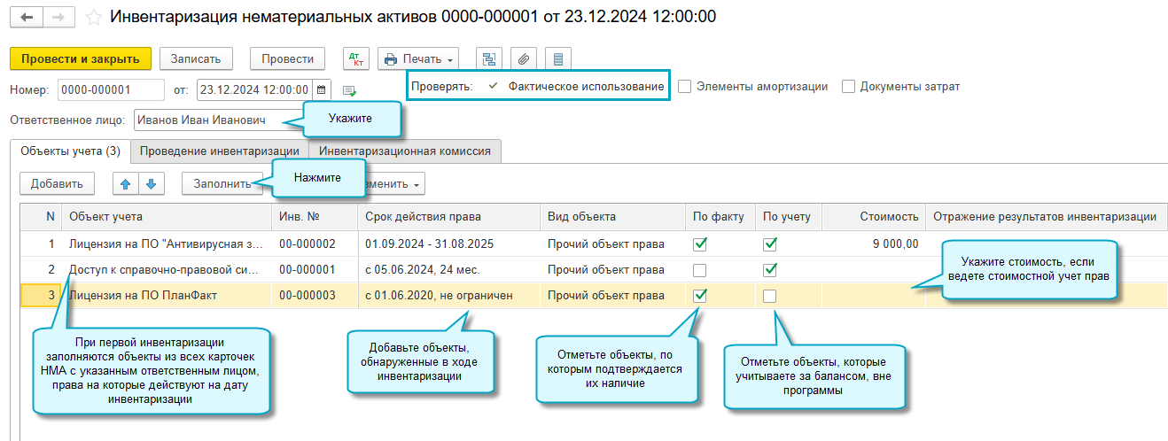 С его помощью можно проверить фактическое использование - сравнить фактическое наличие с данными учета, списать отсутствующие права и принять на учет обнаруженные.