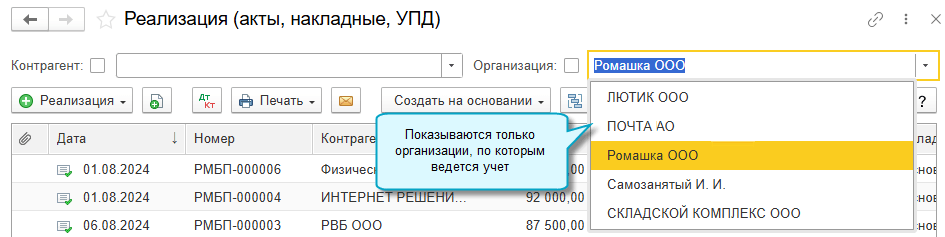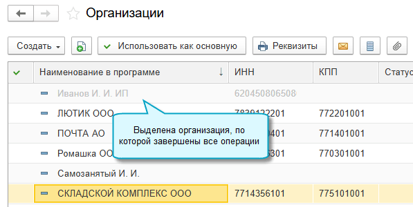 Добавлена возможность скрывать неактуальные организации при выборе организации в документах, отчетах, задачах организации и календаре отчетности. Используйте эту возможность, чтобы скрывать организации, по которым все операции завершены и прекращено ведение учета.