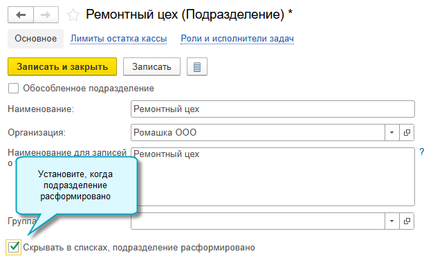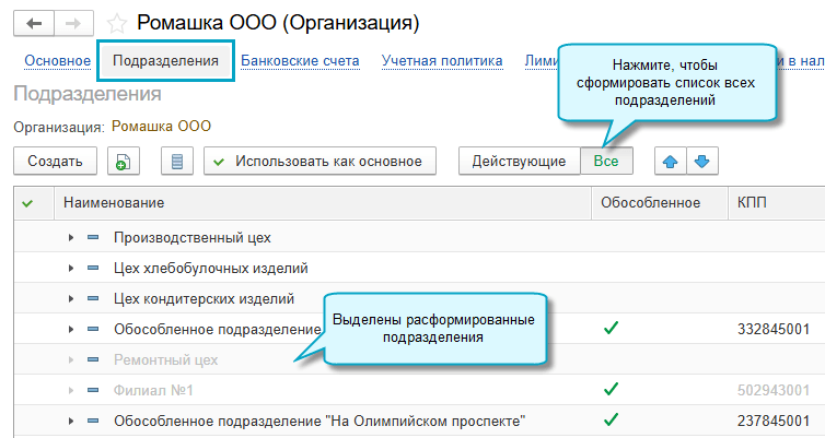 Добавлена возможность показывать только действующие подразделения организации при их выборе в документах и отчетах. Для этого достаточно помечать расформированные подразделения.
