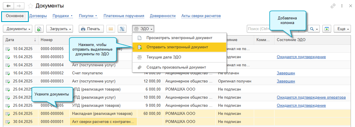 В общий список документов добавлена колонка с состоянием ЭДО.